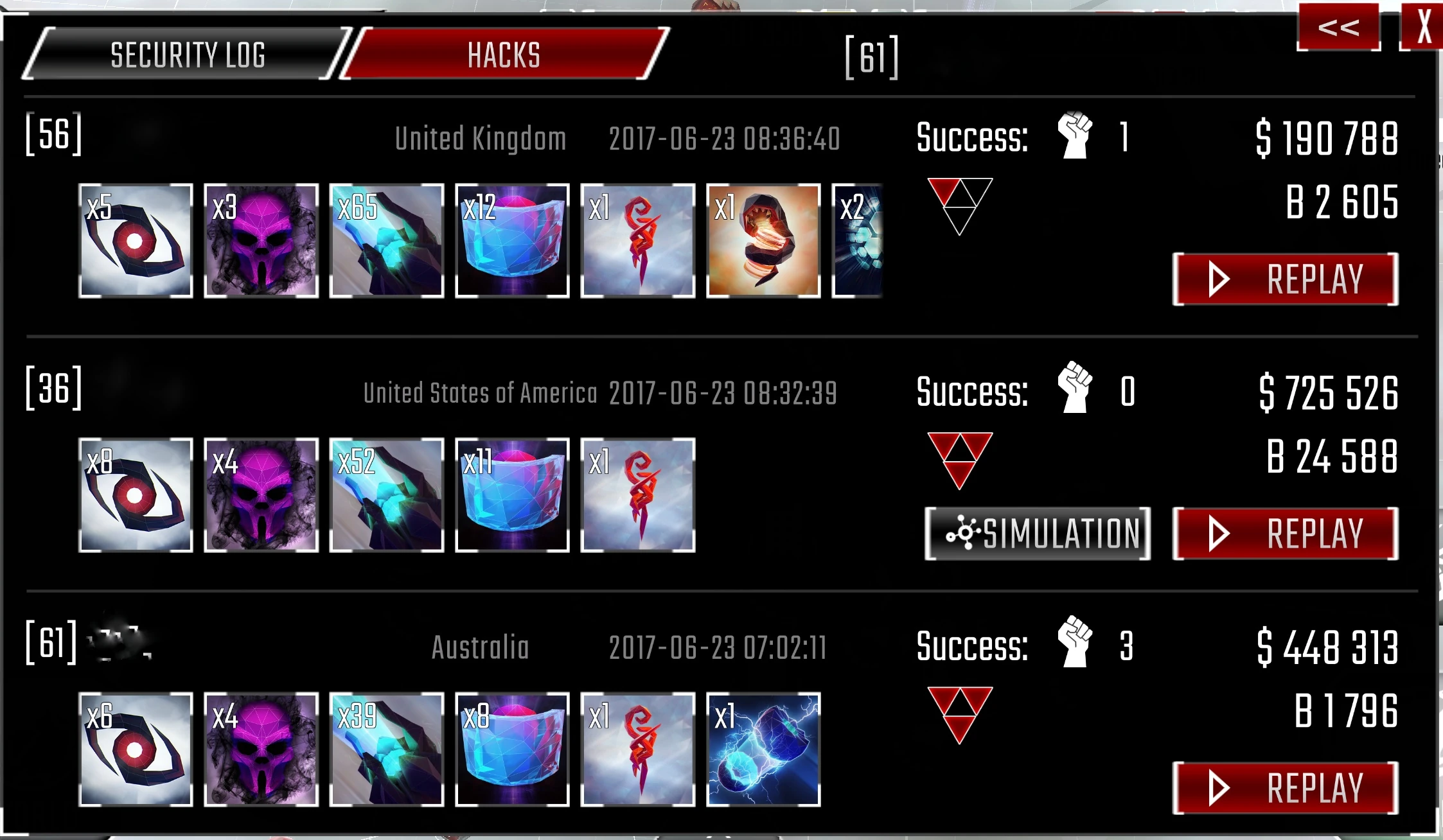 In your own hacklog, replays of simulations appear along with all other hacks in the Security Log and Hacks tabs, but show a gray Simulation icon in place of the option to retrace.